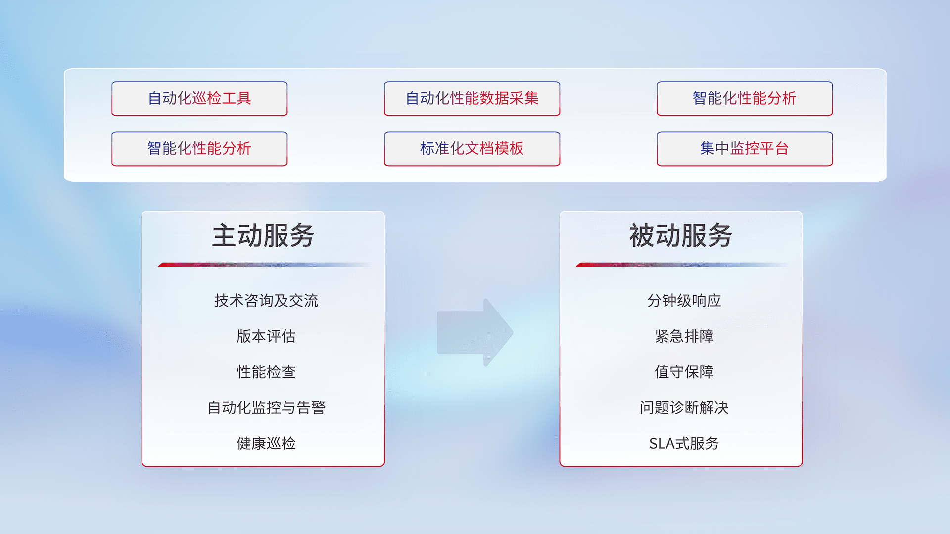 智能化工具和标准化文档,,,保障服务质量,,,,提供主动服务(包含技术咨询、、、、版本评估、、、、性能检查、、、、自动化监控与告警、、、健康巡检)和被动服务包含(分钟级响应、、、紧急排障、、值守保障、、、问题诊断解决、、SLA服务)。。。。